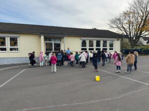 In diesem Jahr sangen die Klassen 1a und 4a, unterstützt von einzelnen Kindern aus den Klassen 4b und 4c. Mit viel Freude und Engagement zauberten die Kinder den Besucherinnen und Besuchern ein Lächeln ins Gesicht. Natürlich gab es auch diesmal ein kleines Dankeschön – nicht nur für die Kinder, sondern auch für die begleitenden Lehrerinnen und Lehrer.